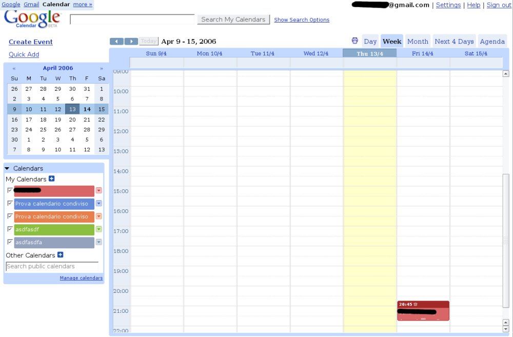 Google Calendar è il nuovo servizio offerto dalla grande G. E' un calendario via web disponibile a tutti gli utenti di gmail. Permette di gestire calendari multipli dove si possono inserire appuntamenti e note come fosse un normale software di gestione dei calendari. Per il momento si tratta di una versione beta, però è molto meglio di tanti altri software che ho visto in giro. Le caratteristiche fondamentali sono:
